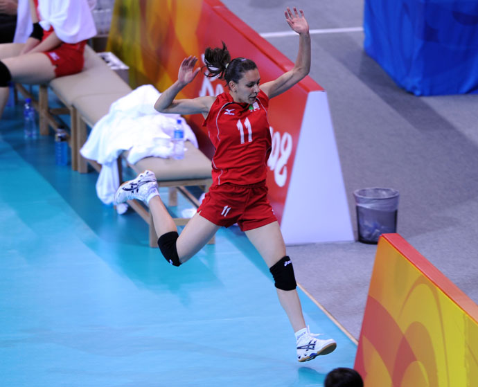 8月9日,在北京奧運(yùn)會(huì)女排小組賽中,阿爾及利亞隊(duì)球員阿卜杜勒·拉希姆沖出場(chǎng)地救球。