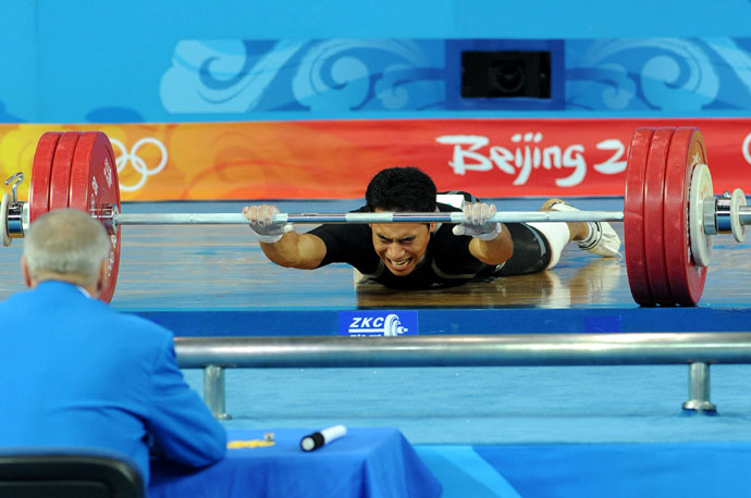 8月12日,雅典奧運會男子舉重69公斤級亞軍得主、韓國選手李培永在北京奧運會舉重男子69公斤級決賽挺舉比賽中失誤,但仍緊緊抓住杠鈴。李培永在挺舉的三次試舉中,因為第一舉受傷而導(dǎo)致最后兩舉功敗垂成,與獎牌失之交臂。