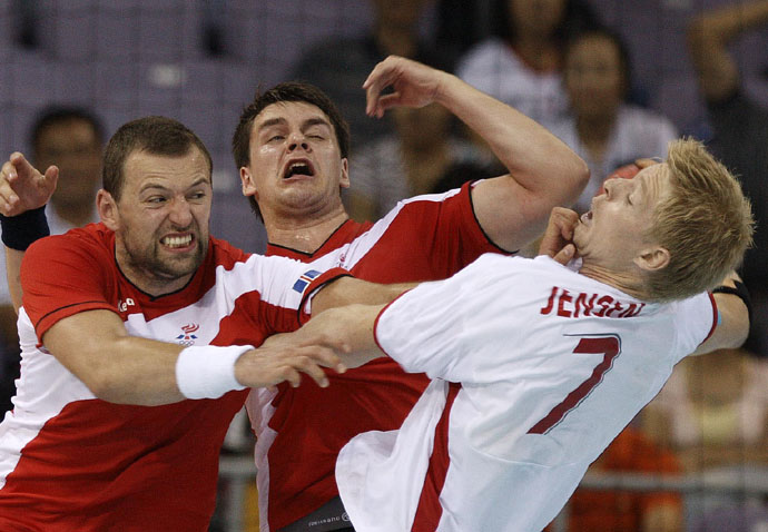 當(dāng)日,在北京奧運會手球男子預(yù)賽B組第24場的比賽中,冰島隊以最后4秒得到的七米球追平丹麥隊,戰(zhàn)成32比32。