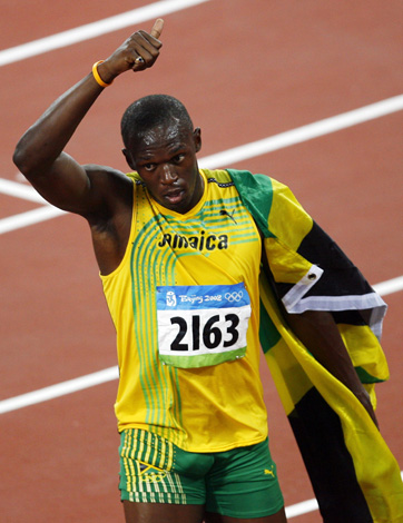 8月16日,牙買加選手尤塞恩·博爾特在比賽后慶祝。當(dāng)日,博爾特在國家體育場“鳥巢”進(jìn)行的北京奧運(yùn)會男子100米決賽中以9秒69的成績奪得金牌并打破9秒72的世界紀(jì)錄。