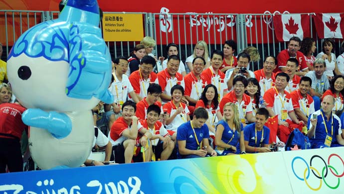 8月17日,福娃“貝貝”與中國跳水隊隊員和英國跳水隊隊員齊為選手助威。當日,北京奧運會女子3米跳板決賽在國家游泳中心——“水立方”舉行。
