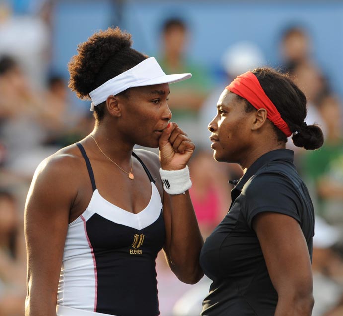 8月16日,大威廉姆斯(左)和小威廉姆斯在女雙比賽中商量對策。