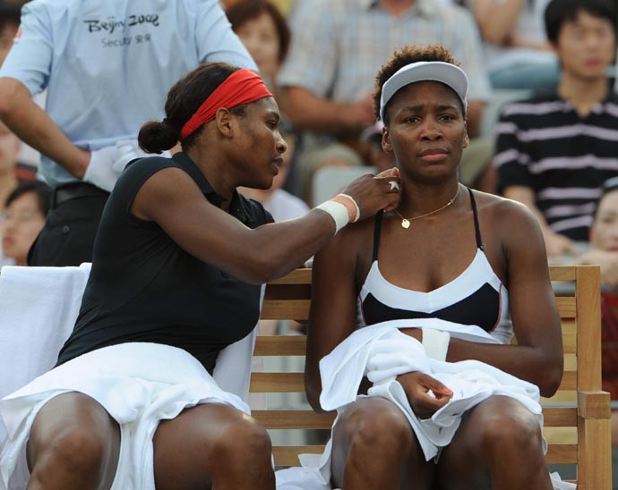 8月16日,小威廉姆斯(左)在女雙比賽間隙幫助大威廉姆斯整理項(xiàng)鏈。