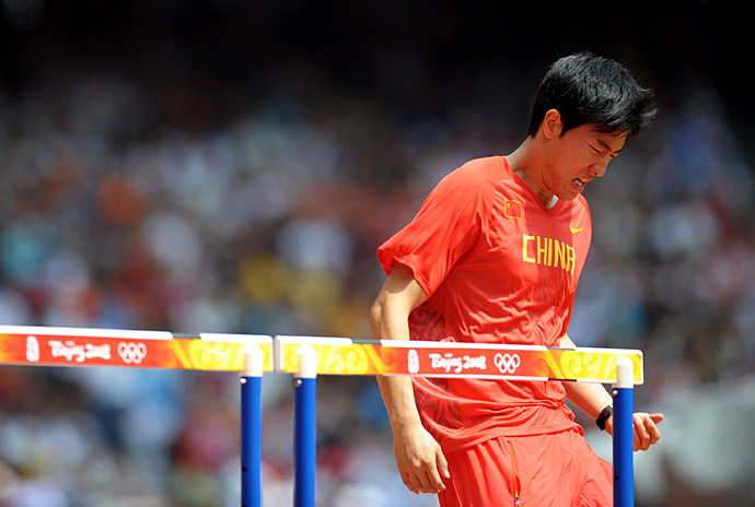 8月18日,中國選手劉翔在比賽前進(jìn)行上場準(zhǔn)備時(shí)感到不適。當(dāng)日,劉翔在北京奧運(yùn)會(huì)男子110米欄第一輪比賽中,因?yàn)槟_跟之傷退出比賽。