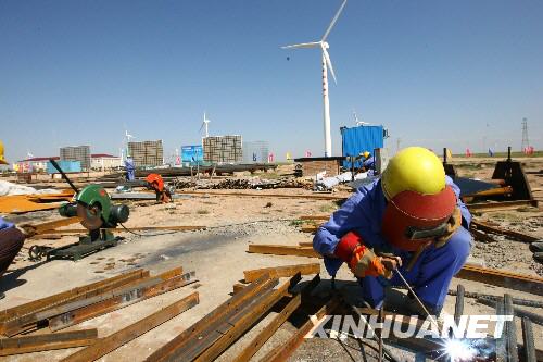 8月17日,一名工人正在太陽山風電場工地作業(yè)。 位于寧夏吳忠市太陽山移民開發(fā)區(qū)的太陽山風電場是寧夏發(fā)電集團有限責任公司投資建設的10個風電場之一。太陽山風電場一期45MW工程60臺風力發(fā)電機已于4月2日全部成功并網發(fā)電,預計投資4.7億元的二期49.5MW工程項目也正在籌劃進行中。寧夏正在邁出重點開發(fā)風力和太陽能綠色能源的步伐。
