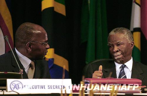 8月17日,在南非約翰內(nèi)斯堡舉行的南部非洲發(fā)展共同體(南共體)首腦會(huì)議上,南共體執(zhí)行秘書(shū)長(zhǎng)薩洛芒(左)和南非總統(tǒng)姆貝基交談。第28屆南共體首腦會(huì)議當(dāng)天在約翰內(nèi)斯堡閉幕,會(huì)議通過(guò)了聯(lián)合公報(bào),就南部非洲經(jīng)濟(jì)一體化和地區(qū)政局等問(wèn)題達(dá)成了若干共識(shí)。南共體自由貿(mào)易區(qū)也于當(dāng)天正式啟動(dòng)。新華社/法新 | |
