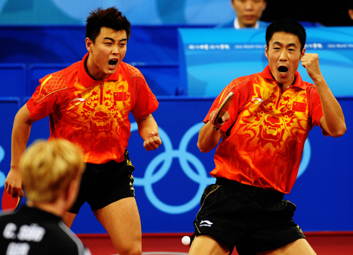 8月18日,中國選手王皓(左)/王勵勤慶祝勝利。當(dāng)日,中國隊在北京奧運會乒乓球男子團(tuán)體決賽中以3比0戰(zhàn)勝德國隊,摘得金牌。