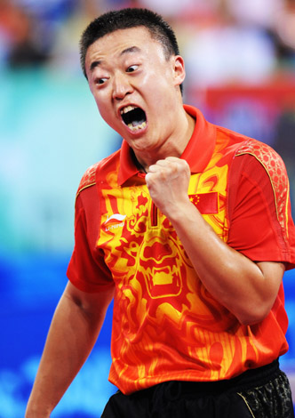 8月18日,中國選手馬琳慶祝得分。當(dāng)日,中國隊(duì)在北京奧運(yùn)會乒乓球男子團(tuán)體決賽中以3比0戰(zhàn)勝德國隊(duì),摘得金牌。