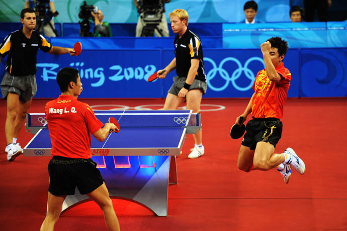 8月18日,中國選手王皓(右一)/王勵勤(左二)慶祝勝利。當日,中國隊在北京奧運會乒乓球男子團體決賽中以3比0戰(zhàn)勝德國隊,摘得金牌。