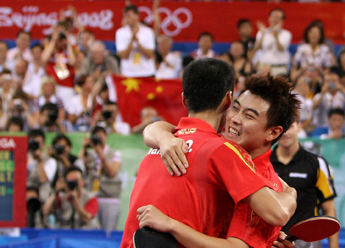 8月18日,中國選手王勵勤/王皓(右)歡慶勝利。當日,中國隊在北京奧運會乒乓球男子團體決賽中以3比0戰(zhàn)勝德國隊,摘得金牌。