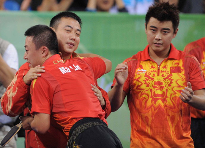8月18日,中國選手馬琳(左一)獲勝后和主教練劉國梁擁抱。當(dāng)日,中國隊(duì)在北京奧運(yùn)會(huì)乒乓球男子團(tuán)體決賽中以3比0戰(zhàn)勝德國隊(duì),摘得金牌。