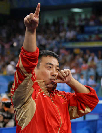 8月18日,中國男隊主教練劉國梁賽后親吻項鏈。當(dāng)日,中國隊在北京奧運(yùn)會乒乓球男子團(tuán)體決賽中以3比0戰(zhàn)勝德國隊,摘得金牌。