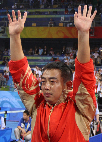 8月18日,中國男隊主教練劉國梁向觀眾致意。當日,中國隊在北京奧運會乒乓球男子團體決賽中以3比0戰(zhàn)勝德國隊,摘得金牌。