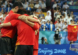8月18日,中國(guó)隊(duì)在北京奧運(yùn)會(huì)乒乓球男子團(tuán)體決賽中以3比0戰(zhàn)勝德國(guó)隊(duì),摘得金牌。