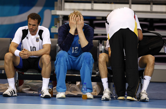 8月18日,德國隊門將約翰內(nèi)斯·比特(左二)雙手掩面坐在條凳上。