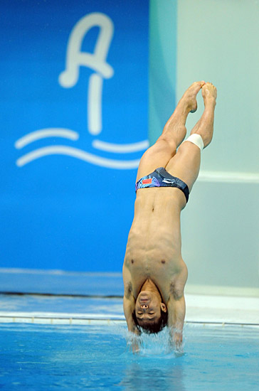 8月19日,中國(guó)選手何沖在比賽中。當(dāng)日,北京奧運(yùn)會(huì)跳水比賽在國(guó)家游泳中心——“水立方”繼續(xù)進(jìn)行,何沖在男子3米跳板決賽中獲得冠軍。