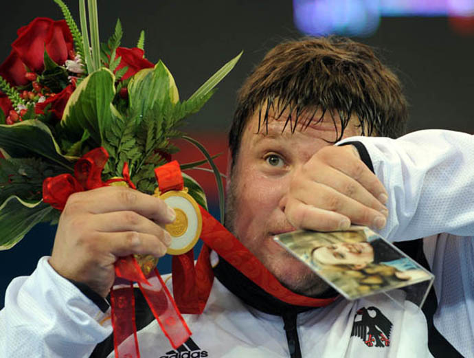 8月19日,德國(guó)選手馬蒂亞斯·施泰納在舉重男子105公斤以上級(jí)決賽中以461公斤的總成績(jī)摘得金牌。圖為馬蒂亞斯·施泰納在領(lǐng)獎(jiǎng)臺(tái)上手持金牌、鮮花和妻子的照片喜極而泣。