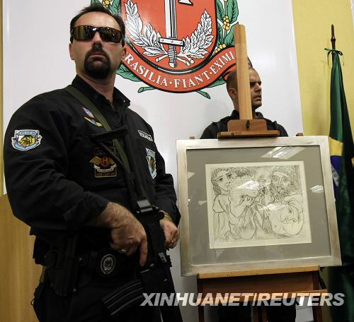 8月18日,巴西警察在巴西圣保羅向人們展示失而復(fù)得的畢加索畫作《彌諾陶洛斯、酒鬼和女人》!稄浿Z陶洛斯、酒鬼和女人》于6月12日在巴西圣保羅一家畫廊被人偷走,當(dāng)時失竊的還有其它三幅名畫。新華社/路透