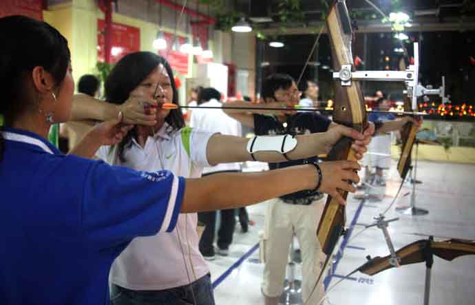 8月19日,幾位業(yè)余射手在北京東方巨龍射箭館練習(xí)。據(jù)這個(gè)射箭館的工作人員介紹,由于中國(guó)女子射箭在北京奧運(yùn)會(huì)上取得歷史性突破,北京射箭愛好者近日逐漸增多。他們紛紛來到向社會(huì)開放的射箭場(chǎng)館一試身手。