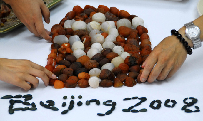8月19日,工作人員用石頭擺出奧運(yùn)會會徽圖案。近日,一組由水晶石、玉石等各類石頭擺成的“奧運(yùn)石頭宴”亮相上海,慶祝北京奧運(yùn)會成功舉辦。