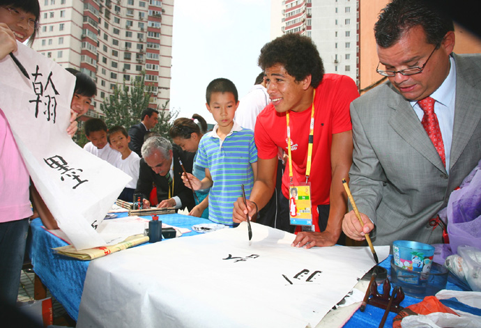 8月19日,智利運(yùn)動(dòng)員埃利奧特(右二)在學(xué)寫毛筆字。當(dāng)日,幾位參加北京奧運(yùn)會(huì)的智利客人來到“同心結(jié)”學(xué)!髁_園五小參觀,向孩子們學(xué)習(xí)剪紙、捏面人和書法等中國傳統(tǒng)藝術(shù)。