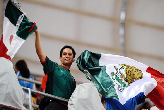 8月19日,外國觀眾在“鳥巢”看臺上展開國旗,為選手們助威加油。北京奧運會田徑比賽在國家體育場漸入高潮,前來“鳥巢”觀賽的觀眾們更是熱情高漲。