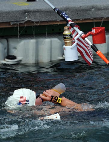 美國選手克洛艾·薩頓在女子10公里馬拉松游泳比賽中補充能量。