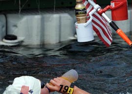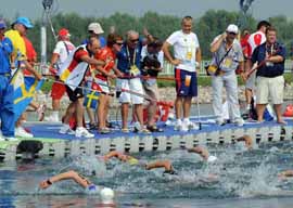 北京奧運(yùn)會馬拉松游泳比賽在順義奧林匹克水上公園的直道水道上往返進(jìn)行,在兩頭的轉(zhuǎn)彎處都設(shè)有“補(bǔ)給站”——一個巨大的固定在岸邊的塑料筏子。教練們站在筏子上把食物、飲料裝在瓶子里挑在竿頭,懸在選手經(jīng)過的水道上空,樣子很像是在釣魚。 一些選手經(jīng)過“補(bǔ)給站”時,伸手取下瓶子,吃上幾口就把瓶子扔在水里。有的人拿到瓶子后還沒吃到嘴,就被別人打掉在水里。不過,因?yàn)楹ε碌⒄`時間或喪失優(yōu)勢位置,大多數(shù)選手都沒有伸手取物。此外,不少選手都在泳衣縫里別上小號的塑料包裝食品或者飲料。