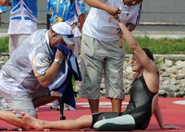 不像室內(nèi)游泳比賽每個選手都有專門水道,馬拉松游泳選手們沒有屬于自己的賽道,她們擠在一起游泳難免碰手碰腳,搶占優(yōu)勢位置也很有講究。 在20日的女子馬拉松游泳比賽中,很多選手上岸后都在抱怨別人的不是。銅牌得主、英國選手帕滕在水中弄傷了腳,她說:“我身上的每個部位都疼,水里有一些拉人動作!苯鹋频弥、俄羅斯選手伊利琴科曾與兩位巴西選手并駕齊驅(qū),她說:“這兩個人太有進(jìn)攻性了,行為舉止接近非體育精神的邊緣,這是游泳,不是拳擊!