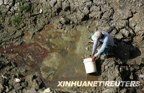 8月20日,在印度尼西亞?wèn)|爪哇省的拉蒙岸,一村民用塑料桶在幾乎干涸的水壩中汲水。新華社/路透
