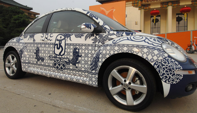 8月20日,一輛車身上繪有青花瓷色彩圖案的汽車停放在北京農(nóng)展館停車場。隨著北京奧運會的召開,中國特色的奧運元素滲透到生活中的方方面面。