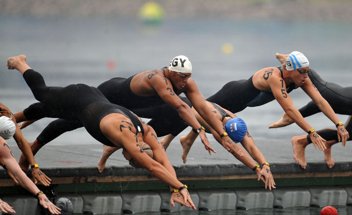8月21日,選手們在男子10公里馬拉松游泳比賽中出發(fā)。當(dāng)日,北京奧運會男子10公里馬拉松游泳比賽在順義奧林匹克水上公園冒雨進(jìn)行。