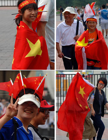 8月20日,中國(guó)球迷帶來國(guó)旗為中國(guó)男籃加油助威(拼版照片)。當(dāng)日,中國(guó)男子籃球隊(duì)在北京奧運(yùn)會(huì)男子籃球四分之一決賽中迎戰(zhàn)立陶宛隊(duì)。這場(chǎng)比賽吸引了大批中國(guó)和立陶宛的球迷觀看,為球員加油助威。