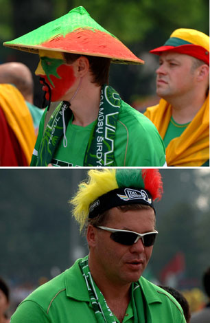 8月20日,“濃妝艷抹”的立陶宛球迷為自己的球隊加油助威(拼版照片)。當(dāng)日,中國男子籃球隊在北京奧運會男子籃球四分之一決賽中迎戰(zhàn)立陶宛隊。這場比賽吸引了大批中國和立陶宛的球迷觀看,為球員加油助威。