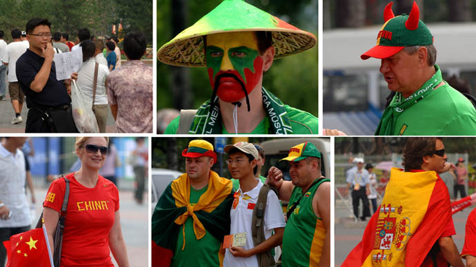 北京奧運會籃球比賽進行得如火如荼,而每次比賽時場內(nèi)外各國球迷的表現(xiàn)也成為另一道獨特的風景。這組拼版照片分別是一名球迷在賽場外求購門票(上左),兩名立陶宛球迷的奇異打扮(上中、上右),一名支持中國隊的外國球迷(下左),中外球迷合影(下中),一名西班牙球迷身披國旗(下右)(8月20日攝)。