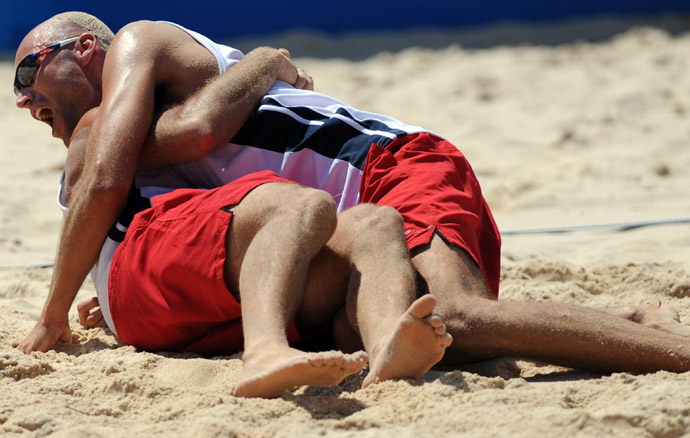 8月22日,美國選手菲利普·達爾豪瑟(上)與托德·羅杰斯賽后慶祝勝利。