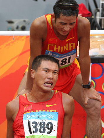 8月22日,中國選手司天峰(下)與李建波在比賽后。當(dāng)日,司天峰在北京奧運(yùn)會(huì)男子50公里競走比賽中獲得第17名,李建波獲得第14名。