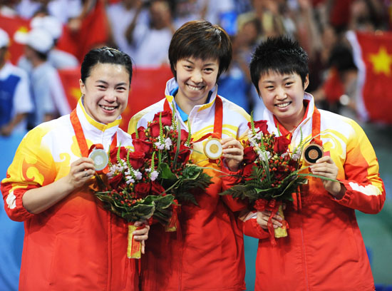 8月22日,中國選手張怡寧(中)、王楠(左)、郭躍在領(lǐng)獎臺上。當(dāng)日,張怡寧、王楠、郭躍在北京奧運(yùn)會乒乓球女子單打決賽中分獲金、銀、銅牌。