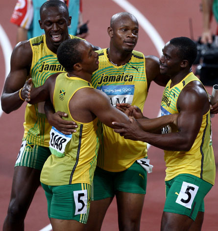 8月22日,牙買加隊選手在比賽后慶祝。當日,牙買加隊在北京奧運會男子4X100米接力決賽中以37秒10的成績奪得金牌并打破世界紀錄。