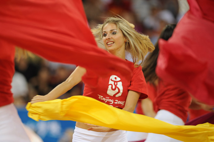 8月22日,拉拉隊(duì)員在比賽間隙表演。當(dāng)日,在北京五棵松奧林匹克籃球館進(jìn)行的北京奧運(yùn)會(huì)男籃半決賽中,西班牙隊(duì)以91比86戰(zhàn)勝立陶宛隊(duì),晉級(jí)決賽。