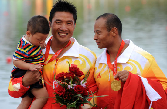 8月23日,孟關(guān)良和楊文軍在北京順義奧林匹克水上公園再次掛上了奧運金牌。 當白色的船艇剛觸碰到終點線,孟關(guān)良和楊文軍就摔落到了水里。“實在是太累了,身體已經(jīng)到極限。剛沖過終點,我就再也無法堅持跪在艇上了!痹诨旌蠀^(qū),孟關(guān)良對于自己落水這樣對新華社記者說。 賽后,兩人的加拿大教練馬克告訴記者,2周前孟關(guān)良的背部就出現(xiàn)了問題。賽前沒有人知道孟關(guān)良還能否出現(xiàn)在奧運賽場上。不過,“他們堅持下來了,是用心在比,表現(xiàn)非常好!敝,馬克激動地說。 男子雙人劃艇500米的頒獎儀式是當天倒數(shù)第二個舉行。當孟關(guān)良和楊文軍掛著閃閃的金牌面朝五星紅旗時,順義奧利匹克水上公園上空響起了熟悉的《義勇軍進行曲》。當觀眾們在為兩人歡呼雀躍時,也許只有孟關(guān)良和楊文軍自己才明白這枚金牌多么來之不易。 “我和他們壓力都很大。4年前奪冠可以說沒什么壓力,但今天不一樣!笨吹絻扇说谝粋沖過終點后,馬克說。 作為上屆雅典奧運會男子雙人劃艇500米衛(wèi)冕冠軍,孟關(guān)良和楊文軍一出現(xiàn)在起航線上,就引起了看臺上無數(shù)中國觀眾的歡呼。當天比賽,孟關(guān)良和楊文軍身穿紅黃相間的中國隊服站在了第5道前。2007年世錦賽冠軍的德國組合克里斯蒂安·吉勒/托馬斯·維倫策克,和預(yù)賽中僅落后兩人0.023秒的俄羅斯組合分列第4道和第3道。 一起航,孟關(guān)良和楊文軍很快便顯示了衛(wèi)冕冠軍的實力。50米過后,逐漸擺脫各艇,率先占據(jù)領(lǐng)先位置,德國隊列第三。然而,兩人的衛(wèi)冕之路并非毫無懸念。250米過后,位于第3道的俄羅斯組合謝爾蓋·烏列金/亞歷山大·科斯托格洛德開始加快速度,從第四位一下躍居第二,并且直逼中國隊。不過,孟關(guān)良和楊文軍在最后50米的奮力沖刺挺住了俄羅斯隊的沖擊,第一個沖過終點,成績是1分41秒025。俄羅斯組合獲得銀牌,德國隊名列第三。 紅地毯上的最高領(lǐng)獎臺上,當孟關(guān)良和楊文軍在鎂光燈前露出勝利笑臉時,突然出現(xiàn)的一位小客人引起了在場所有人的歡呼。孟關(guān)良15個月大的兒子被抱上了領(lǐng)獎臺。當站在臺上的孟關(guān)良從妻子手中接過兒子后,臉上燦爛的喜悅不僅僅來自于胸前掛著的金牌。而一家三口和自己親密“戰(zhàn)友”面對國旗的合影,成為北京奧運會皮劃艇收官之日的一幕經(jīng)典。