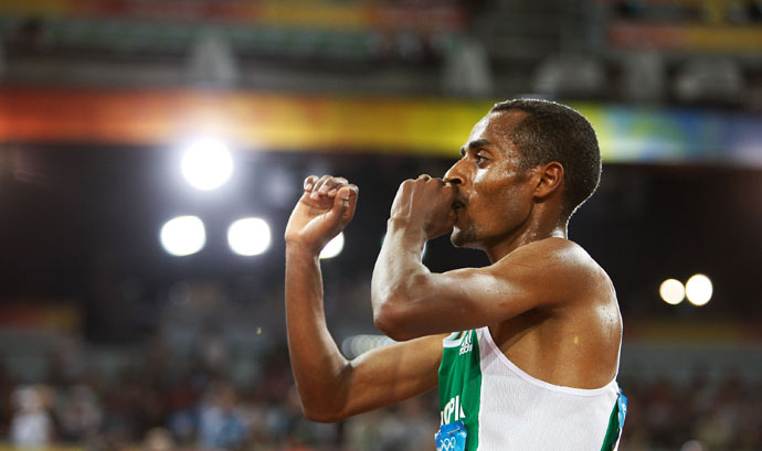 8月23日,埃塞俄比亞選手克內(nèi)尼薩·貝耶查在比賽后慶祝。當(dāng)日,貝耶查在北京奧運(yùn)會(huì)男子5000米決賽中以12分57秒82的成績(jī)奪得金牌并打破奧運(yùn)會(huì)紀(jì)錄。