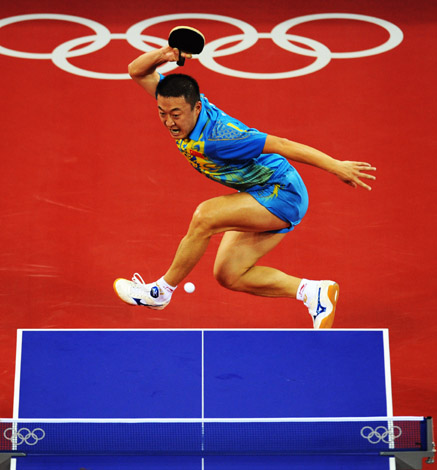 8月23日,中國(guó)選手馬琳在比賽中。當(dāng)日,在北京奧運(yùn)會(huì)乒乓球男子單打決賽中,馬琳以4比1戰(zhàn)勝隊(duì)友王皓,獲得冠軍。
