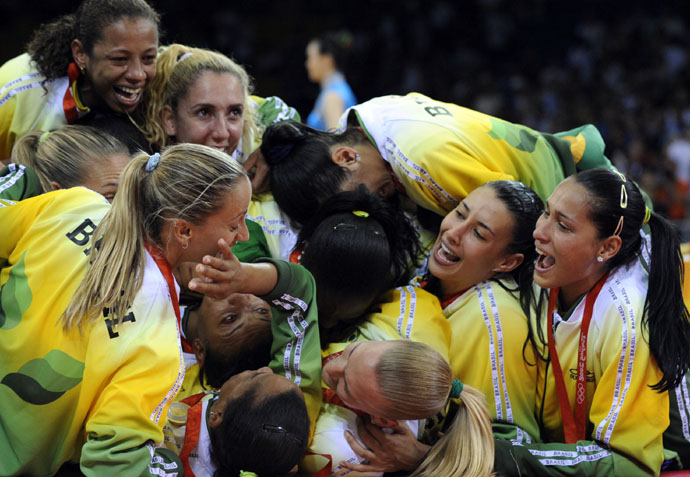 8月23日,兩名巴西隊隊員擁抱慶祝勝利。當(dāng)日,在北京奧運會女排決賽中,巴西隊以3比1戰(zhàn)勝美國隊,獲得冠軍。