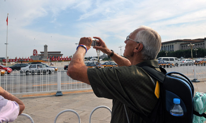8月23日,一位游客在拍攝天安門廣場。隨著北京奧運會即將結(jié)束,大批外國人來到天安門廣場參觀游覽。