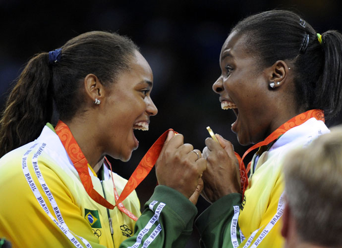 8月23日,兩名巴西隊隊員獲得金牌后慶祝。當日,在北京奧運會女排決賽中,巴西隊以3比1戰(zhàn)勝美國隊,獲得冠軍。