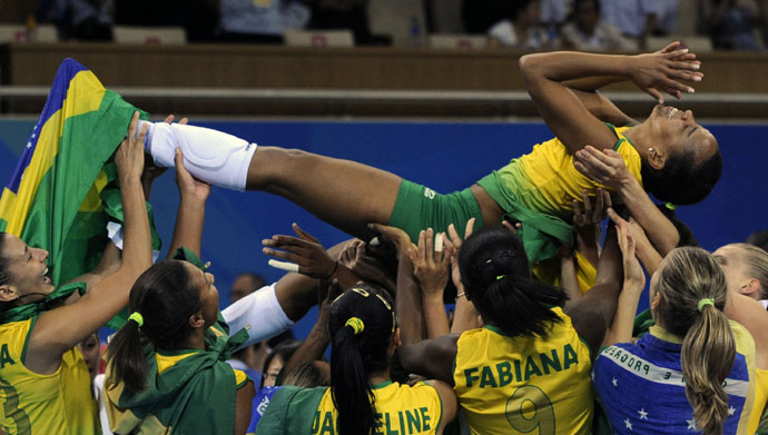 8月23日,巴西隊隊員在獲勝后慶祝勝利。當(dāng)日,在北京奧運(yùn)會女排決賽中,巴西隊以3比1戰(zhàn)勝美國隊,獲得冠軍。