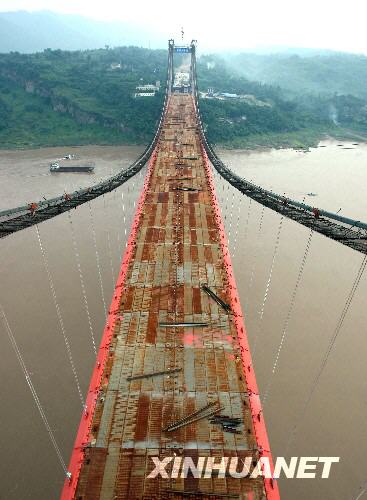 8月24日,隨著編號為“YZ24”的鋼箱梁吊裝到指定位置,重慶魚嘴長江大橋主橋成功合龍。據(jù)介紹,重慶魚嘴長江大橋全長1438米,寬33米,大橋雙向6車道,主跨616米,設計時速100公里,預計2009年內(nèi)通車。