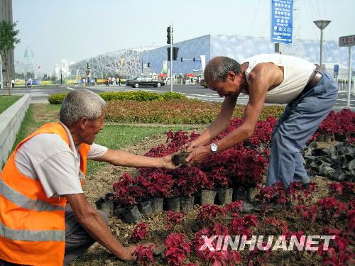 8月27日,北京奧運(yùn)會(huì)閉幕三天后,園藝工人在北京水立方附近為迎接殘奧會(huì)精心擺花。北京2008年殘奧會(huì)將在9月6日開(kāi)幕。