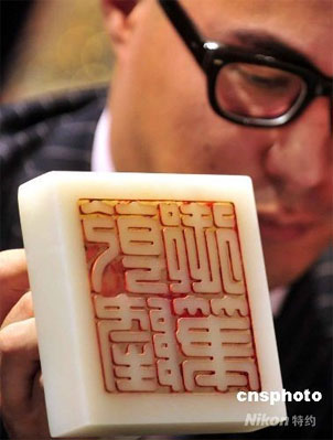 八月二十六日,香港蘇富比舉行“中國瓷器及工藝品秋季拍賣會” 媒體預(yù)展,展示的乾隆帝御寶交龍鈕《乾隆御筆》白玉璽。其玉璽之白玉質(zhì)地極為通靈溫潤,通體潔白致密,而且體量碩大,印面達(dá)到是十二點(diǎn)五平方厘米,是所有乾隆帝名號璽中最大的一方,實(shí)屬罕見。預(yù)料成交價(jià)超過五千萬港元。
